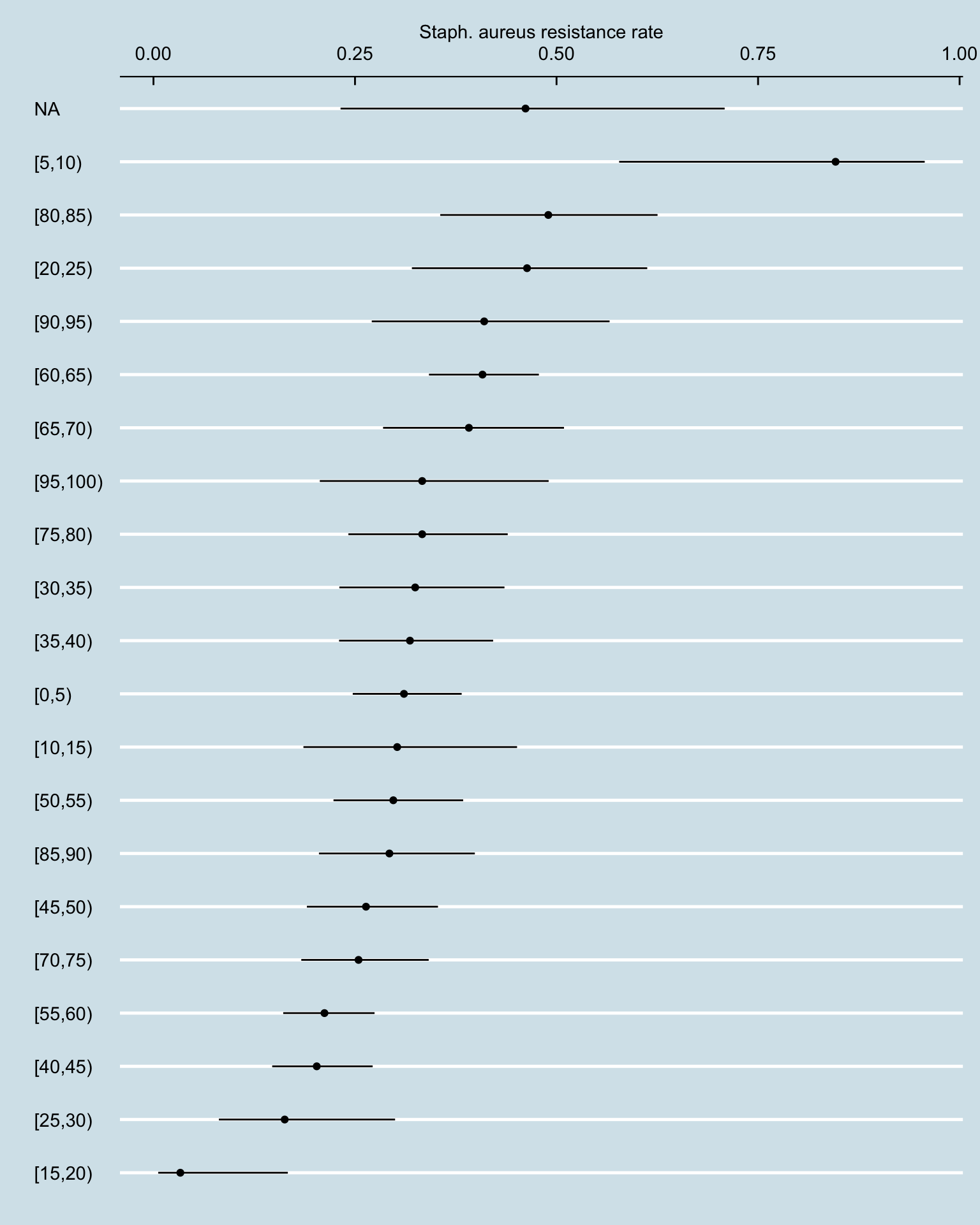 amr_res_ci_age <- amr_long[pathogen_name == "Staphylococcus aureus" & !is.na(resistance), .N, by = .(age_band, resistance)] |>