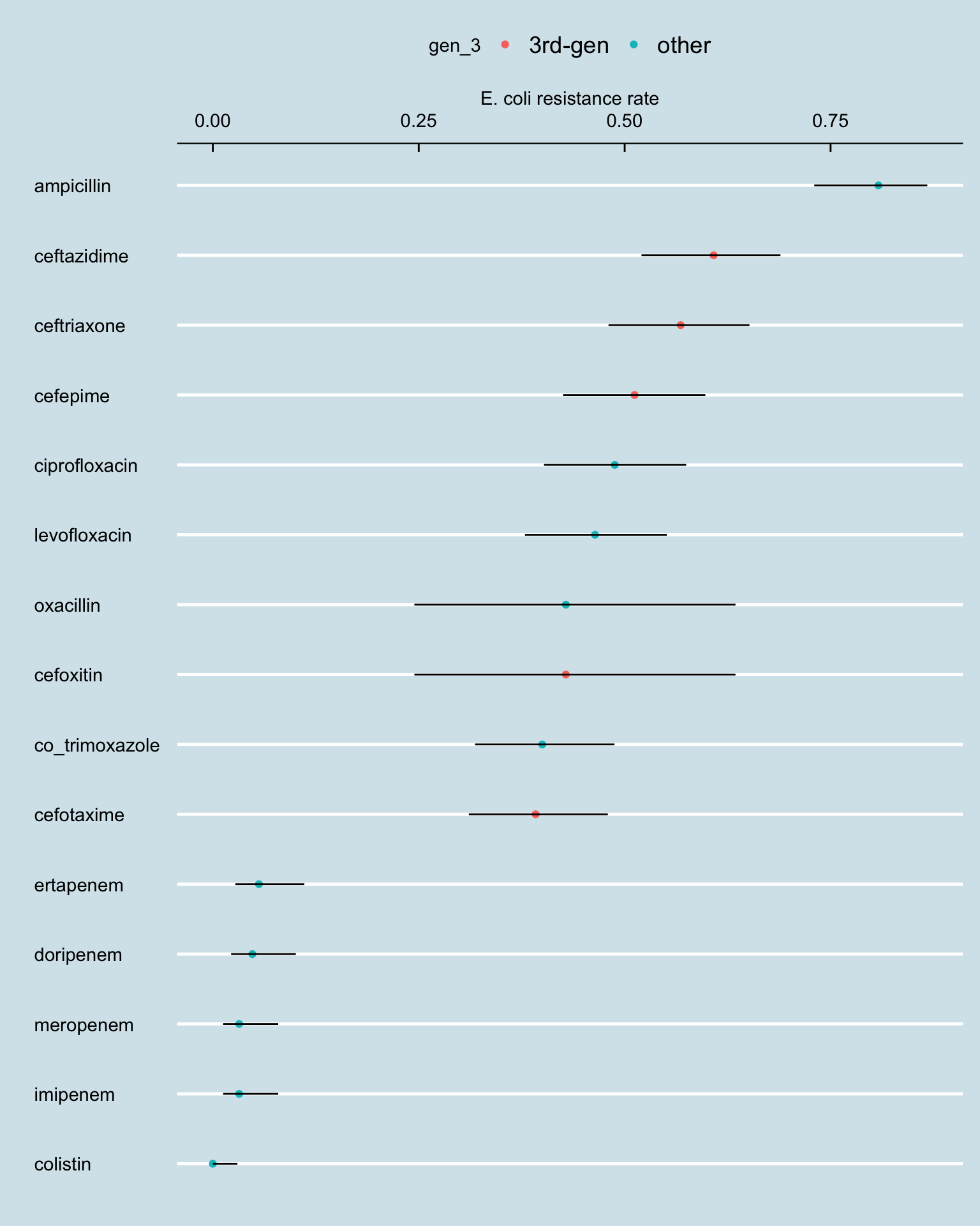 amr_res_ci_ec <- amr_long[str_detect(pathogen_name, "coli") & !is.na(resistance), .N, by = .(antibiotic, resistance, gen_3)] |>