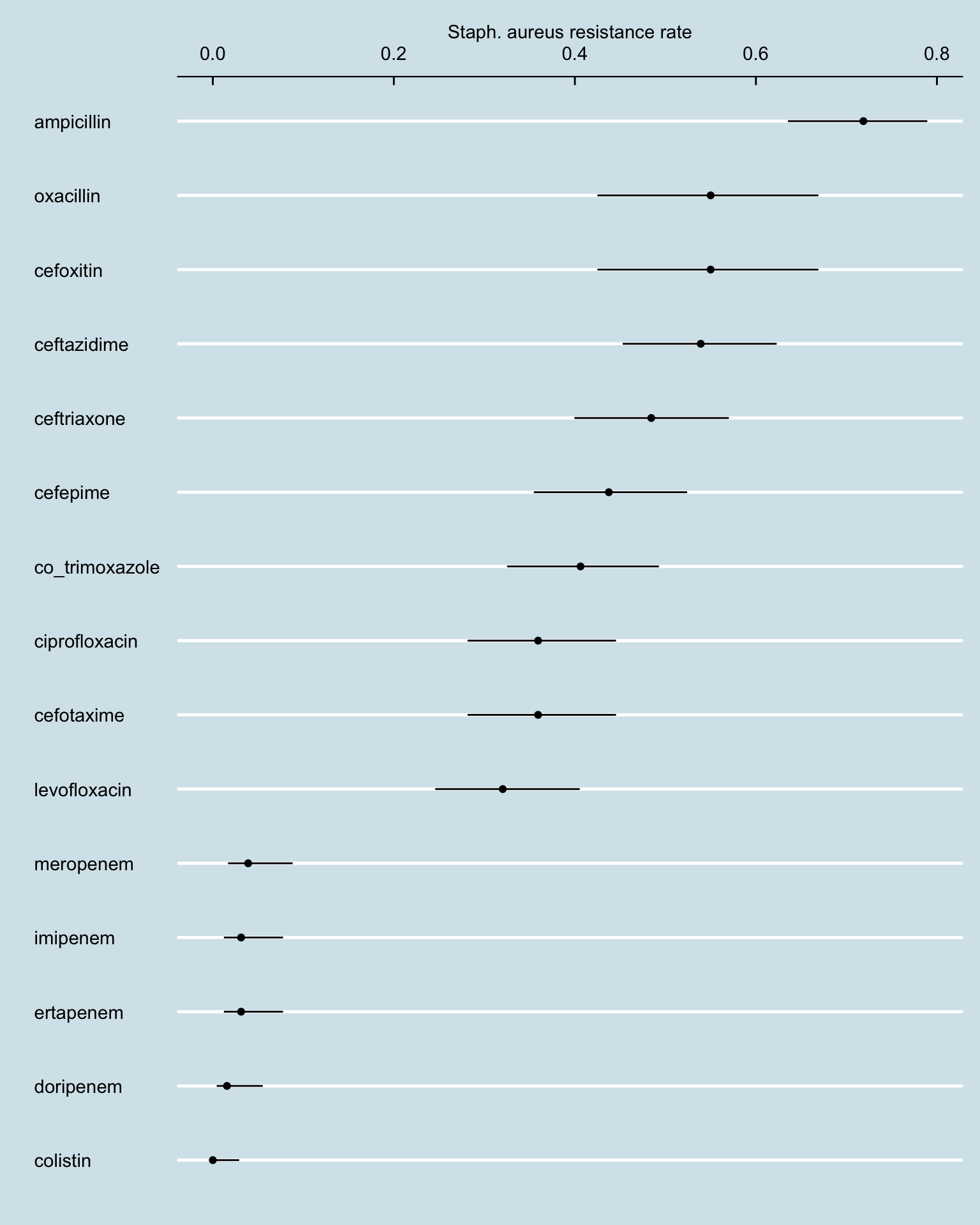 amr_res_ci_sa <- amr_long[pathogen_name == "Staphylococcus aureus" & !is.na(resistance), .N, by = .(antibiotic, resistance)] |>