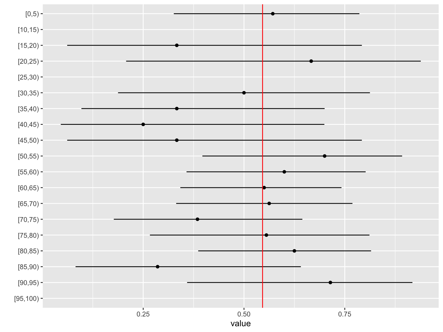 [55,60) | 2 | 6 | 8 | 33 | 50 | 0.66 | 0.250 | 0.0715 | 0.591 | 95% | Wilson |