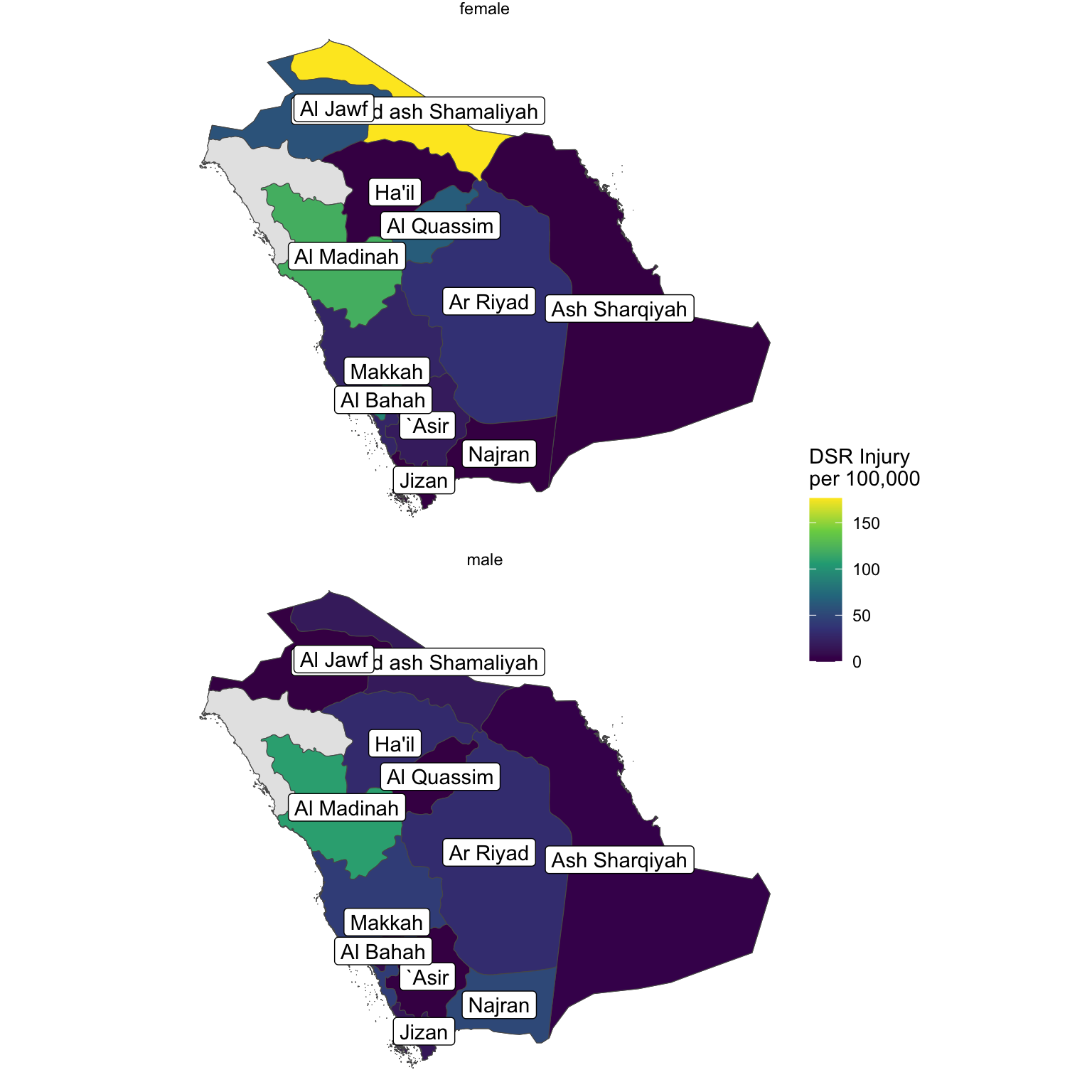 inj <- read_csv("data/injury_dsr.csv")setdiff(inj$region, ksa_bound$ADM1_EN)[1] "'Asir" "Al Madinah al Munawwarah"
