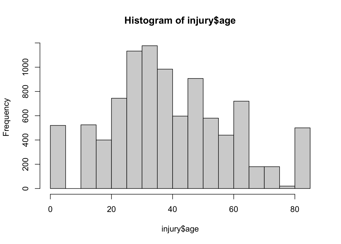Overall there are `r nrow(injury)` records, of which `r sum(is.na(injury$age))` (`r 100 * mean(is.na(injury$age))` % ) have missing dates of of birth. These are excluded from analyis