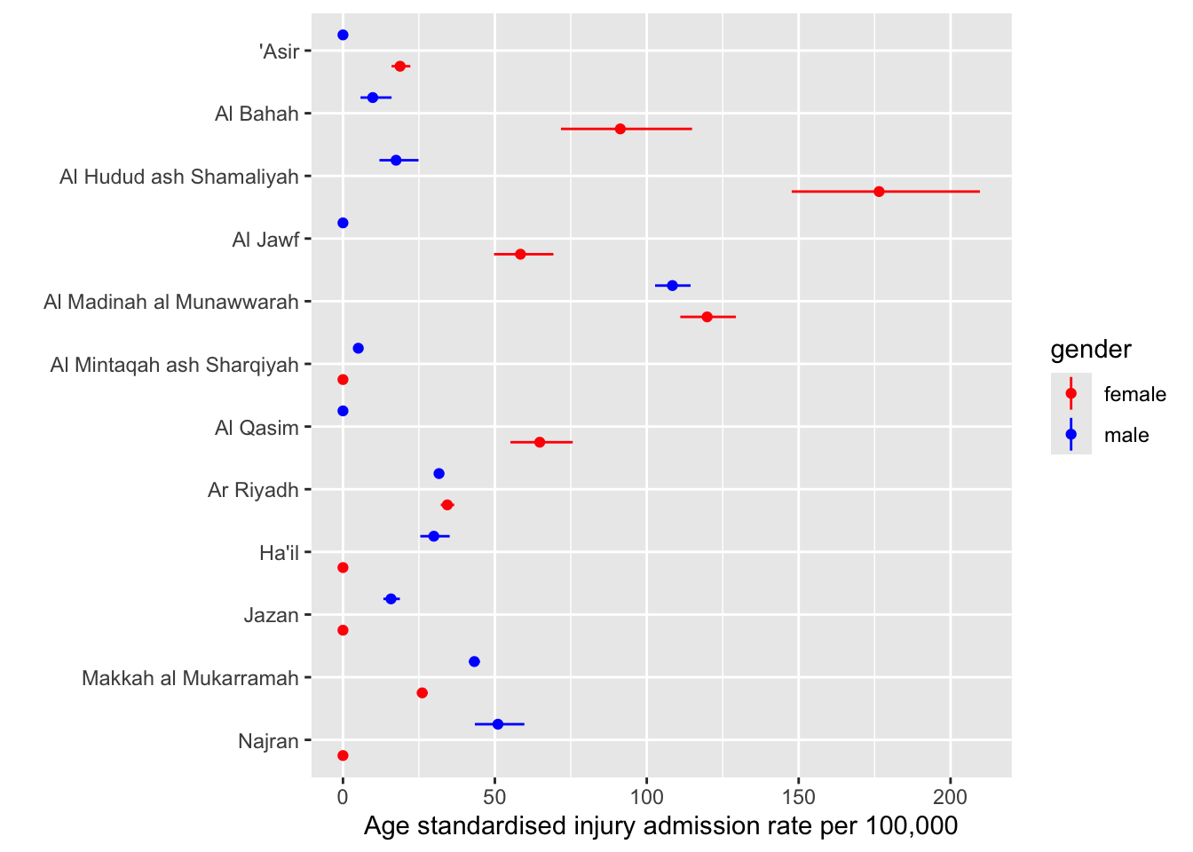 #| fig-cap: "Age standardised injury admission rate per 100,000 by region and gender"